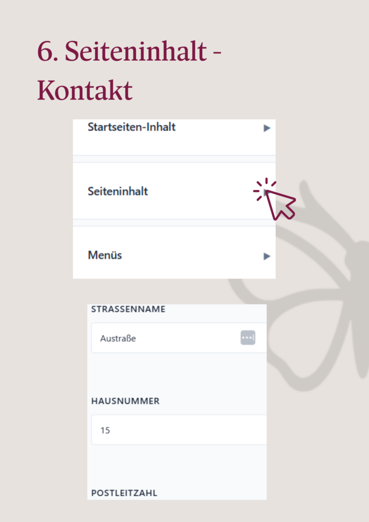 Im Bereich Seiteninhalt kannst du die Kontaktdaten deiner Website eintragen. Diese erscheinen dann übersichtlich auf deiner Kontaktseite und machen es Besucher*innen leicht, dich zu erreichen.