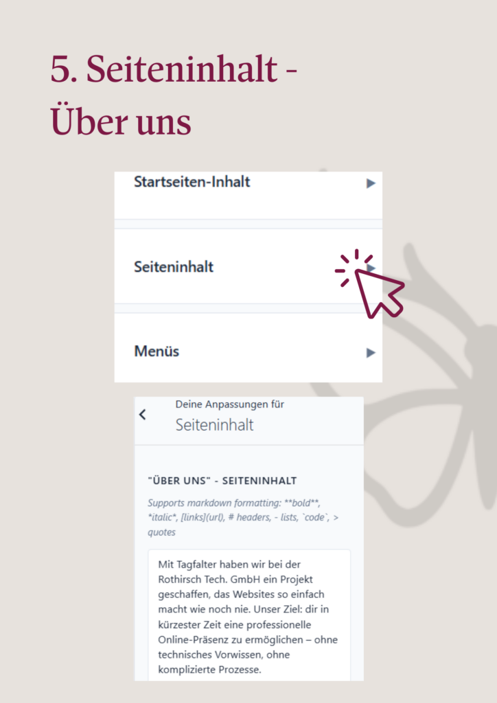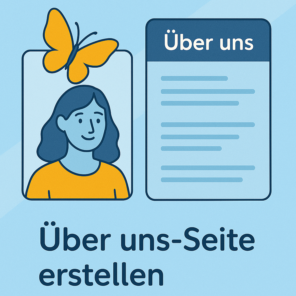 Auf der Über uns-Seite stellst du dein Projekt oder Unternehmen vor. Hier geht es darum, Vertrauen aufzubauen und Besucher*innen einen persönlichen Einblick zu geben.